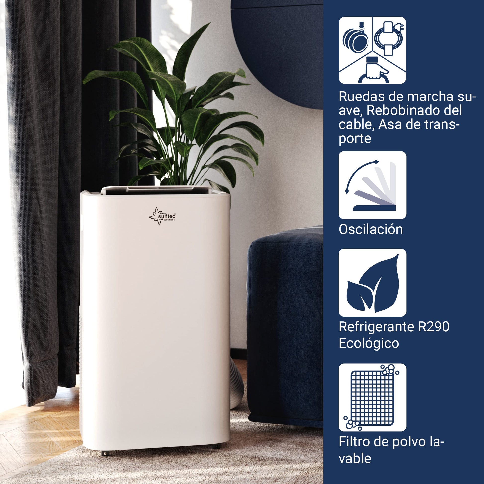 - ❄️ FUNCIÓN APP: Descargue la aplicación SUNTEC Wellness App desde la App Store o Google Play con su smartphone o tableta y conecte su aire acondicionado a WLAN / WiFi. Ahora no solo se puede utilizar el dispositivo mientras se está fuera de casa, sino que también ofrece ajustes y funciones adicionales. Es un valor añadido absoluto.